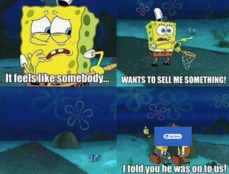 It works because the eyeballs on LinkedIn are more valuable to B2B companies than any other social platform. People on LinkedIn have business goals and problems, with budgets to solve them. Just by showing up in feeds, LinkedIn influencers can get in front of target audiences and build trust with potential customers. When a person engages with a LinkedIn post, the post is then shown to people that person is connected with. This helps influencers reach new, relevant business audiences who may have never heard about the person or company before in a way that builds trust — someone they know is “vouching” for this person by engaging. This incentivizes creators to make engagement bait — bold hot takes, “inspiring” stories, faux vulnerability, recycled business lessons, toxic positivity (to the point of me worrying that you’re actually down bad), and even selfies. Personally, I think the random selfies attached to LinkedIn thought leadership posts are one of the funniest things on the internet. Keep it up.